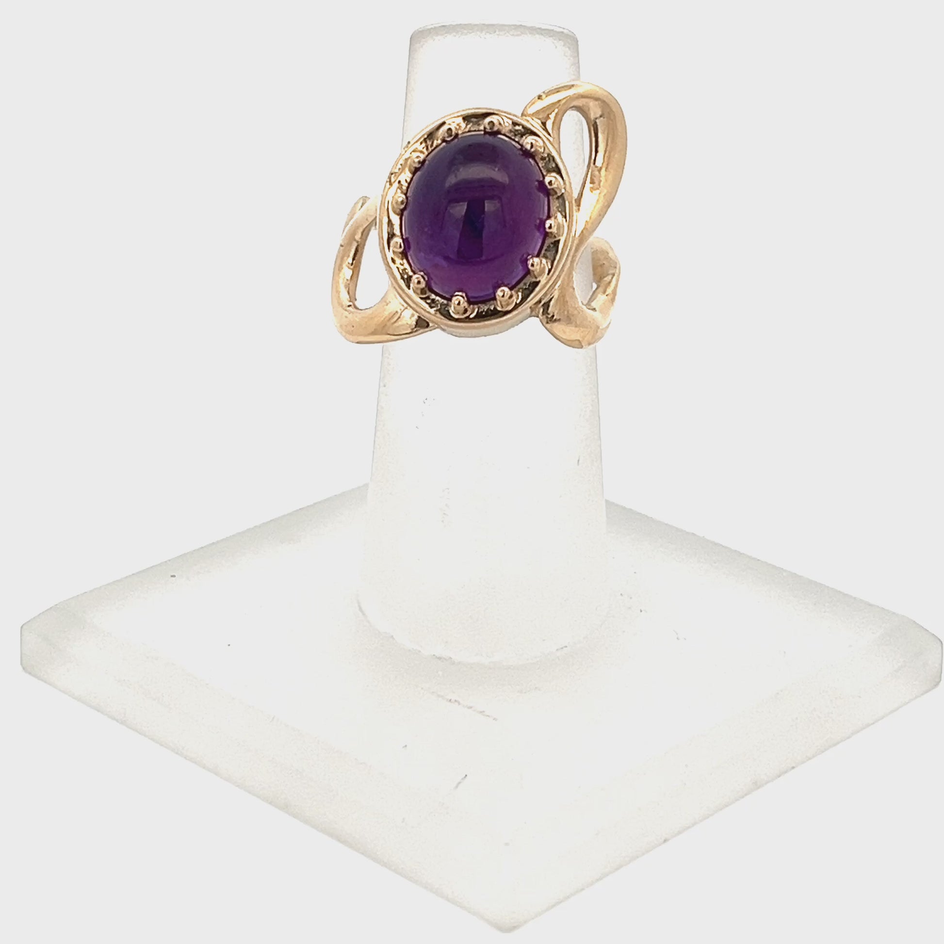AMT designs presents its signature art nouveau inspired statement cocktail ring. This one of a kind piece features a beautifully set cabachon amethyst in 14K yellow gold. A sure head-turner and one-of-a-kind piece you wont find anywhere else.